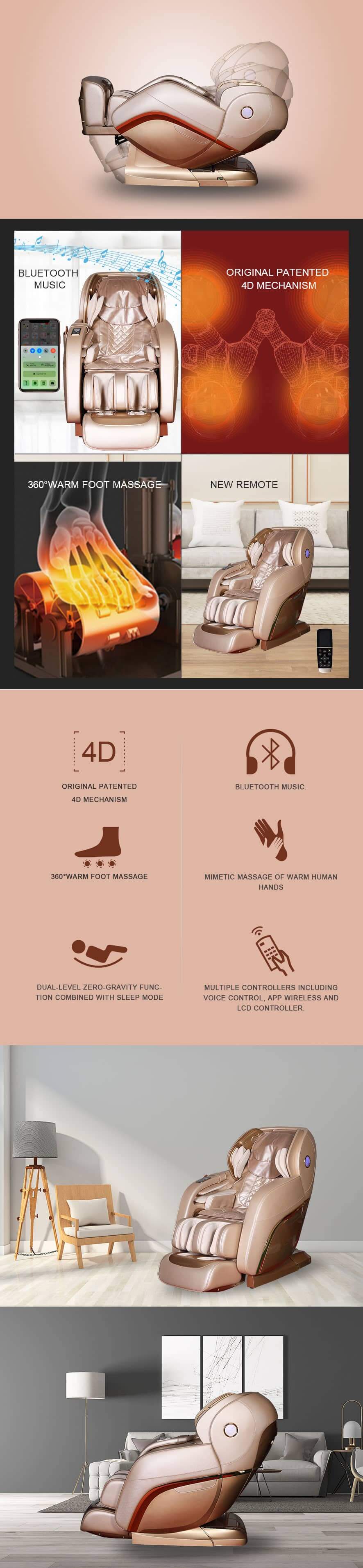 Originaalse patendiga 4D kuumutusega massaaži mehhanism, millel rullikute kuumutamise funktsioon tagab soojuse kanduvuse sügavale lihastesse. Massaaži tool on varustatud mitmete funktsioonidega nagu sõtkumine, koputamine, shiatsu, muljumine, kiire selja hõõrumine. Loominguliselt jäljendab inimkäte ühendatud tehnikaid.